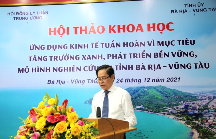 Sáng ngày 24/12/2021, tại tỉnh BR-VT, Hội đồng Lý luận Trung ương (HĐLLTW) phối hợp cùng Tỉnh ủy tỉnh BR-VT tổ chức Hội thảo khoa học “Ứng dụng Kinh tế tuần hoàn vì mục tiêu tăng trưởng Xanh, phát triển bền vững, mô hình nghiên cứu tại tỉnh Bà Rịa – Vũng Tàu”.