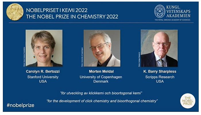 Giải Nobel Hóa học được trao cho 3 nhà khoa học vì công trình phát triển “hóa học click và hóa học sinh trực giao” (06/10/2022)