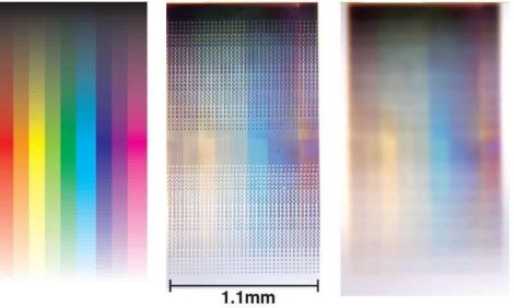 Mẫu trộn màu thí nghiệm các bức ảnh lấy nét và ảnh mờ cho thấy độ bão hòa và khả năng kiểm soát độ sáng của thuật toán thiết kế điểm ảnh plasmon. Ảnh: James et al. © 2016 Hiệp hội Hóa học Hoa Kỳ