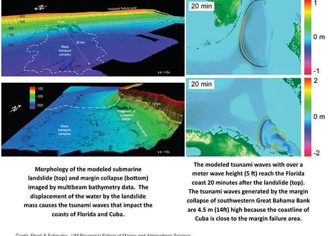 Thông thường, các nhà khoa học ứng dụng các mô hình toán học để đánh giá nguy cơ và khả năng sóng thần ở Mỹ. Sau đó họ dựa theo các sóng của sóng thần để đưa ra nhiều kịch bản của vụ lở đất ngầm dưới đáy biển bắt nguồn từ các bãi ngầm lớn nhất Bahama này để xác minh những vụ lở đất dưới đáy biển này và các vết đứt gãy bờ biền trong khu vực này có thể tạo ra các dòng biển nguy hiểm và có thể gây ra các cơn sóng thần nguy hiểm có độ cao vài mét dọc theo bờ biển phía đông của Florida và phía bắc Cuba.