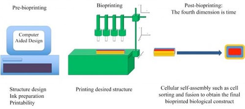 Một máy in đùn nạp một vật liệu, được gọi là bioink, vào một ống tiêm và in nó bằng cách phun mực ra bằng piston hoặc áp suất không khí. Bioink có thể là một tập hợp các tế bào sống tinh khiết hoặc đình chỉ các tế bào trong hydrogel hoặc polymer. Máy in phun sinh học hoạt động theo cách tương tự nhưng sử dụng tinh thể áp điện hoặc lò sưởi để tạo ra các giọt từ một lỗ nhỏ. Máy in laser tập trung một chùm tia laser vào một dải ruy băng, trong đó một lớp mỏng sinh học được lan truyền và dẫn đến khả năng tồn tại của tế bào cao.